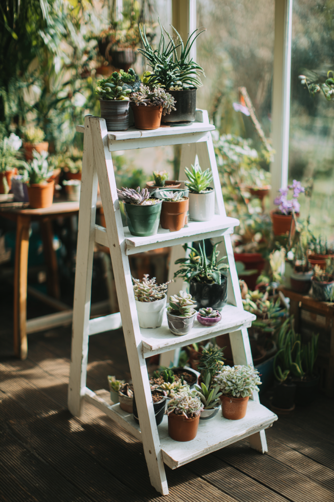 This time, use a step ladder as a tiered plant stand. Sand it. Paint it if you want. Arrange plants on each step.