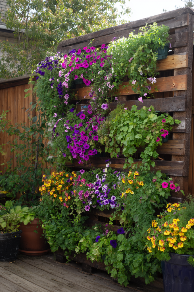 Clean a pallet thoroughly. Secure the slats to create pockets. Fill with soil. Add plants—flowers, herbs, succulents, whatever grows in your climate.